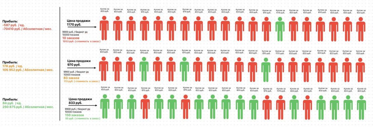 🚀Замер обьема ЦА через цену: На рисунке выше я наглядно показал, как за счет ЦЕНЫ увеличивается или уменьшается ЦА (спрос), на продукт который мы продаем. В каждом ценовом диапазоне есть своя емкость по кол-ву покупателей: Не смотря на то, что при цене 970 руб. у нас максимальная прибыль на 1 единицу, но в среднем 20 заказов в день, при всем нашем желании, мы не сможем сделать 40 заказов в день, оставаясь в тех же показателях расхода по рекламе на 1 единицу в заказ и сохранить 178 руб. прибыль на единицу. Если данная настройка, находится в пике своих ограничей по ЦА, то при увеличении бюджета на рекламу с одной стороны, стоимость привлечения на 1 единицу будет рости, а норма прибыли на 1 единицу снижаться. Пример: ведро с клейстером 10 литров (ограничение по емкости ца по цене 970 руб. ) если мы его перевернем, то получим +- 9 литров (минимальные усилия 80/20 когда 20% усилий дадут 80% результата ) = 20 заказов при расходе 113 руб / заказ если начинаем трясти то по каплям еще наб