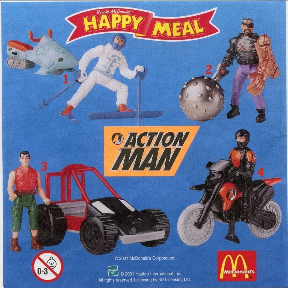 Action Man - мультсериал о Алексе Манне и его команде Xtreme. Любитель острых ощущений Алекс обнаруживает, что он наделен способностями, которые позволяют ему предвидеть опасность. Вместе со своей командой он путешествует по миру и участвует в экстремальных спортивных соревнованиях. В McDonald's Алекс со своей командой появляется не один раз. Список можно посмотреть в конце статьи. В данной серии Action Man 2001 представлены следующие герои: 1. Алекс в костюме лыжника со снегоходом. 2. Доктор Икс с буловой. 3. Алекс и багги. 4. Алекс в костюме мотогонщика на мотоцикле . В моей коллекции есть следующие игрушки: Другие серии посвященные Action Man: Если интересуют другие игрушки из McDonald's , то переходим на Главную страницу