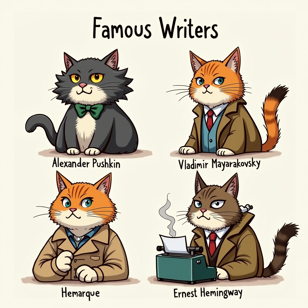 Говорят, что питомцы часто похожи на своих хозяев. А что, если бы у великих писателей были кошки, отражающие их литературную натуру? Я долго размышляла над этим животрепещущим вопросом, пока мой собственный кот пытался уничтожить мою коллекцию книг (очевидно, литературный критик растёт). И вот что из этого получилось.