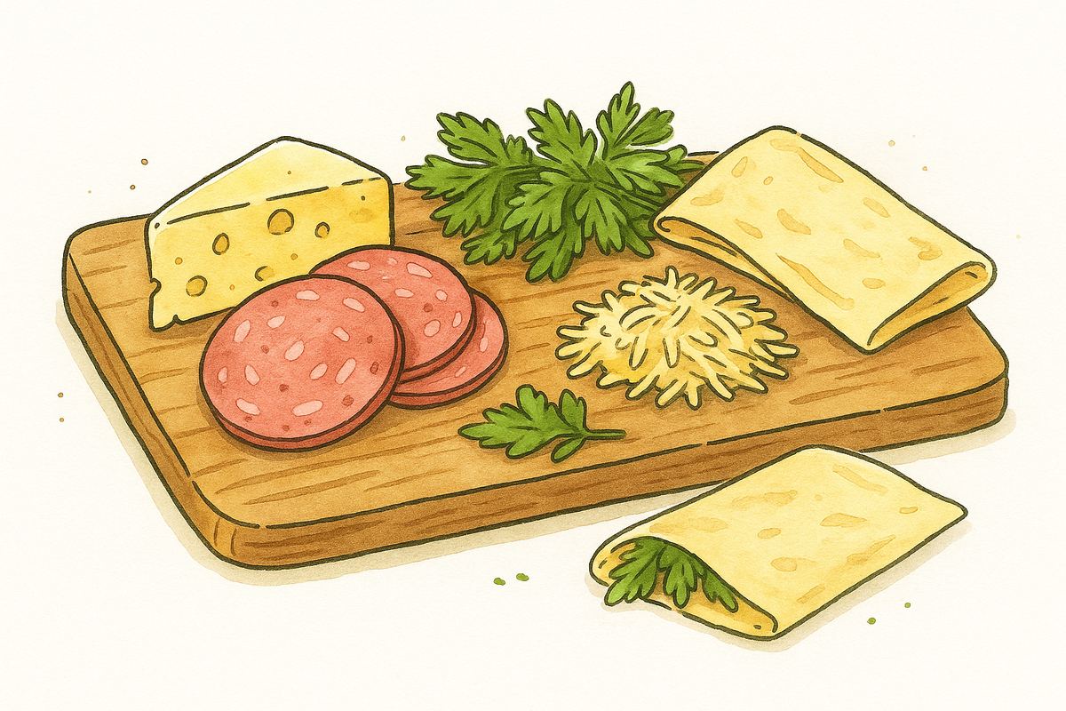 Начинку можно менять по настроению: сыр, варёная колбаса, остатки курицы, немного овощей. Я обычно режу тоненько кусочки колбасы и тру немного сыра. Главное — не переборщить с количеством, иначе будет неудобно заворачивать. Зелень по желанию, но с ней вкус ярче.