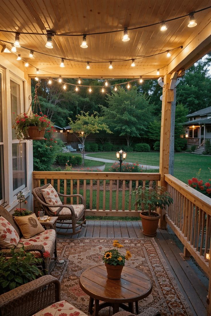Пледы, кресла, гирлянды, растения — всё, что создаёт уют и атмосферу загородной жизни.
