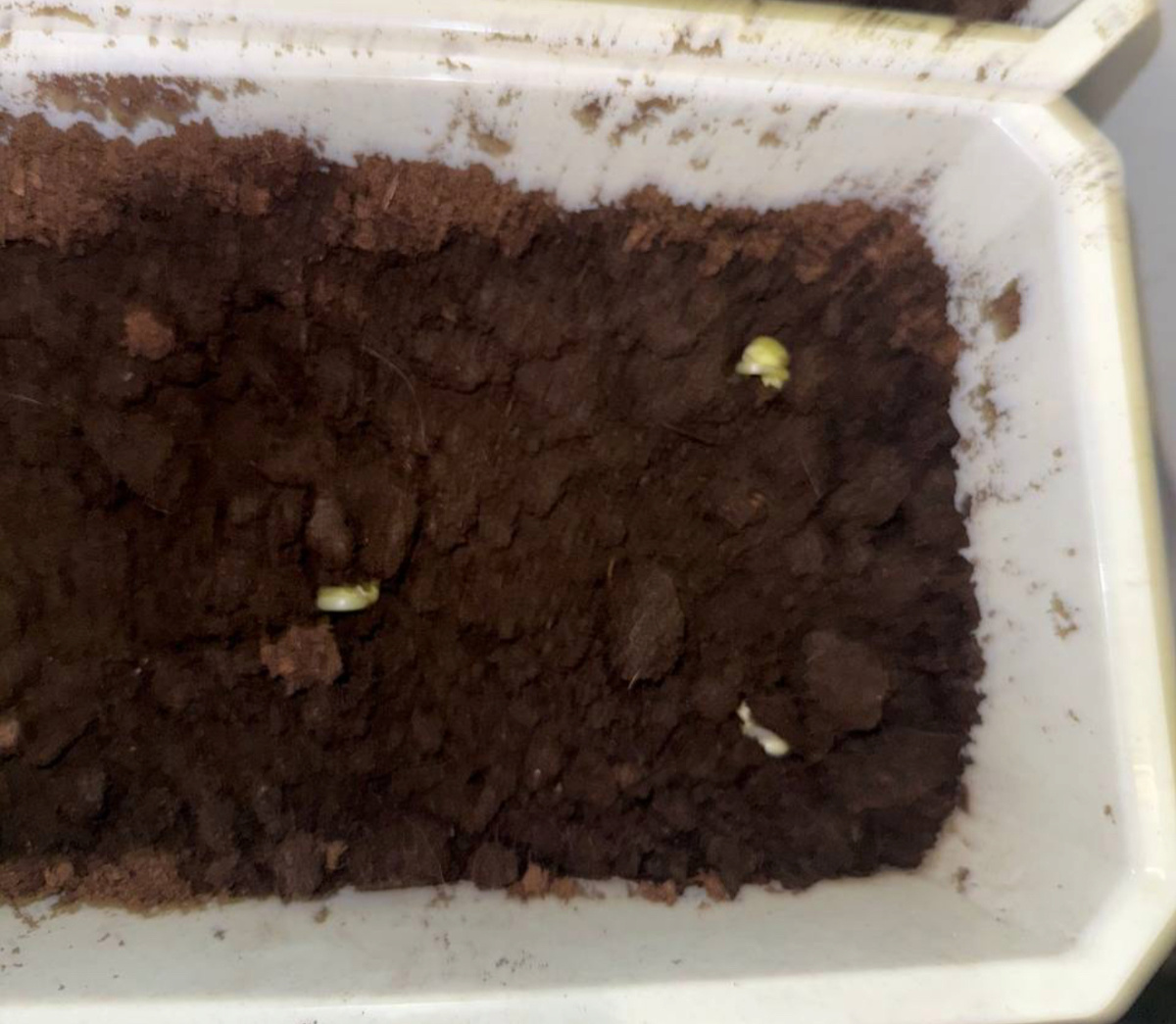 Через пару дней семена проклюнулись. Я посадила их в пластиковый контейнер с рыхлой землёй и поставила на подоконник. Через 4 дня появились крепкие росточки, такие толстенькие, пушистые — как маленькие арбузы на ножках.