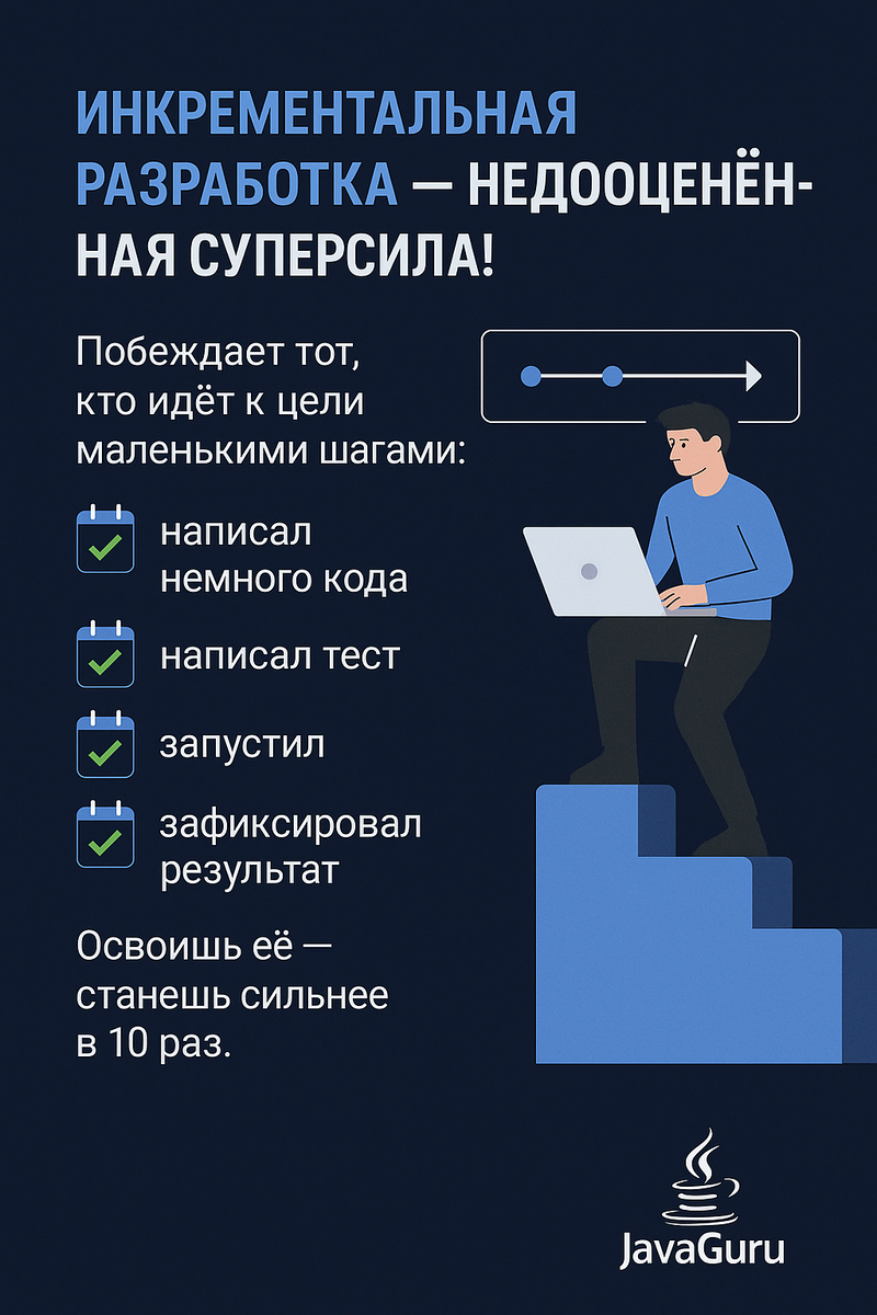 Многие новички думают, что код пишется большими кусками. А потом — раз! — и всё работает. На деле всё иначе. 🔥 Побеждает тот, кто идёт к цели маленькими шагами: написал немного кода ✅ написал тест ✅ запустил ✅ зафиксировал результат ✅ пошёл дальше ✅ Это не просто стиль — это способ думать и двигаться безопасно, уверенно, с постоянной обратной связью. Инкрементальная разработка = меньше багов, больше контроля, меньше стресса. 💬 Освоишь её — станешь сильнее в 10 раз. #инкременты #разработка #javaguru #тестирование #советыпрограммисту #стажировка #java https://stepik.org/course/210937/info https://stepik.org/course/210937/promo