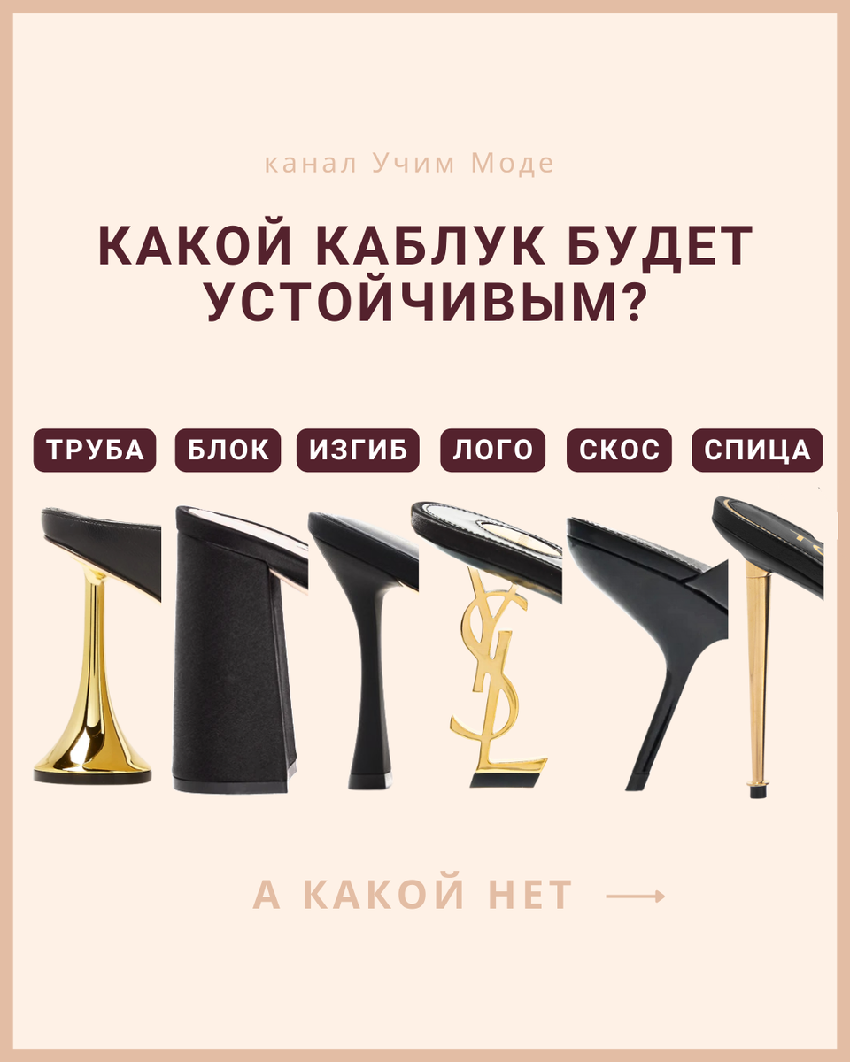 Кто был в ситуации: купила шикарнейшие туфли мечты, стильные, изящные, красивые, но оказалось, что носить их сколько-нибудь продолжительно невозможно. Потому что больно, неудобно, тяжело балансировать и т д Все были. Чтобы такого не было, составили для вас рейтинг каблуков по степени устойчивости, чтобы вы заранее знали, на что идете при покупке обуви. ✅ Любая попытка сделать стандартную шпильку шире, то есть распределить давление, разумеется, облегчает нагрузку на ноги. Поэтому рюмочки и трубы, расширенные в нижней части, концептуально - это очень даже стабильные каблуки. Но! ❌ Если основание у такой рюмочки - это тонюсенький стебелек, то на пятку будет огого какое давление. Поэтому когда нам нужна повышенная устойчивость, следим, чтобы основание каблука тоже было широким. ❌ Иногда бывает тяжело балансировать, когда расширение книзу большое, а верх тонкий. Это делает некоторые модели неудобными для ходьбы. ✅ Самый устойчивый вариант, думаю, все прекрасно знают. На каждый день, на
