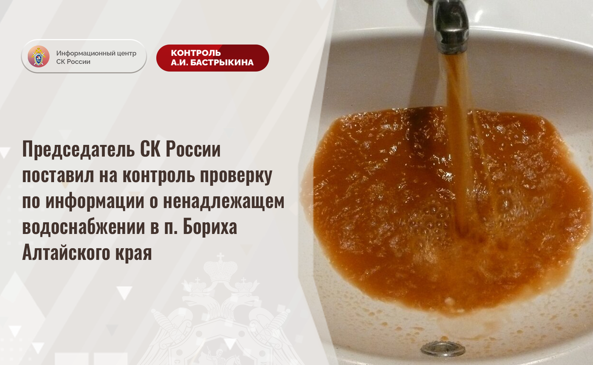 Председатель СК России поставил на контроль проверку по информации о ненадлежащем водоснабжении в п. Бориха Алтайского края В социальной сети сообщается, что в поселке Бориха Алтайского края из-за ненадлежащего обслуживания инженерных сетей в жилые дома на протяжении длительного времени подается жизненно необходимый ресурс, непригодный для питья и бытовых нужд, содержащий ржавчину и осадок. Многочисленные обращения результатов не принесли. В СУ СК России по Алтайскому краю по данному факту организована процессуальная проверка. Председатель Следственного комитета Российской Федерации Александр Иванович Бастрыкин поставил ход процессуальной проверки на контроль в центральном аппарате ведомства и поручил руководителю СУ СК России по Алтайскому краю Игорю Владимировичу Колесниченко представить доклад о ее промежуточных результатах и принятом по итогам решении. #СледственныйКомитет #СКРоссии #СКР #ИЦСКР #ИнформационныйЦентр #АлександрБастрыкин #ПредседательСКР #КонтрольПредседателяСКР #Ком