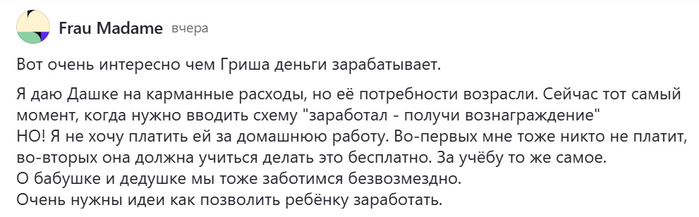 Поэтому да, как только деньги понадобились, вот прямо в тот момент, когда он сидел за уроками и сказал, что у меня мало денег, я в ту же секунду попрала все свои установки про "не платить за уроки" и сказала "зарабатывай", Гриша: - Как? Я: - Вот, ты делаешь уроки. Это твоя работа. В конце ты получишь оплату. Столько-то. ОК? ОК.
