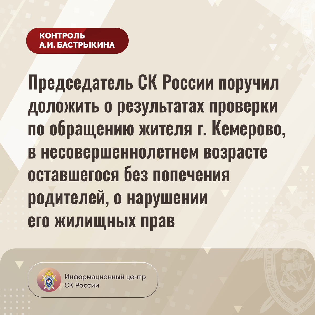 Председатель СК России поручил доложить о результатах проверки по обращению жителя г. Кемерово, в несовершеннолетнем возрасте оставшегося без попечения родителей, о нарушении его жилищных прав