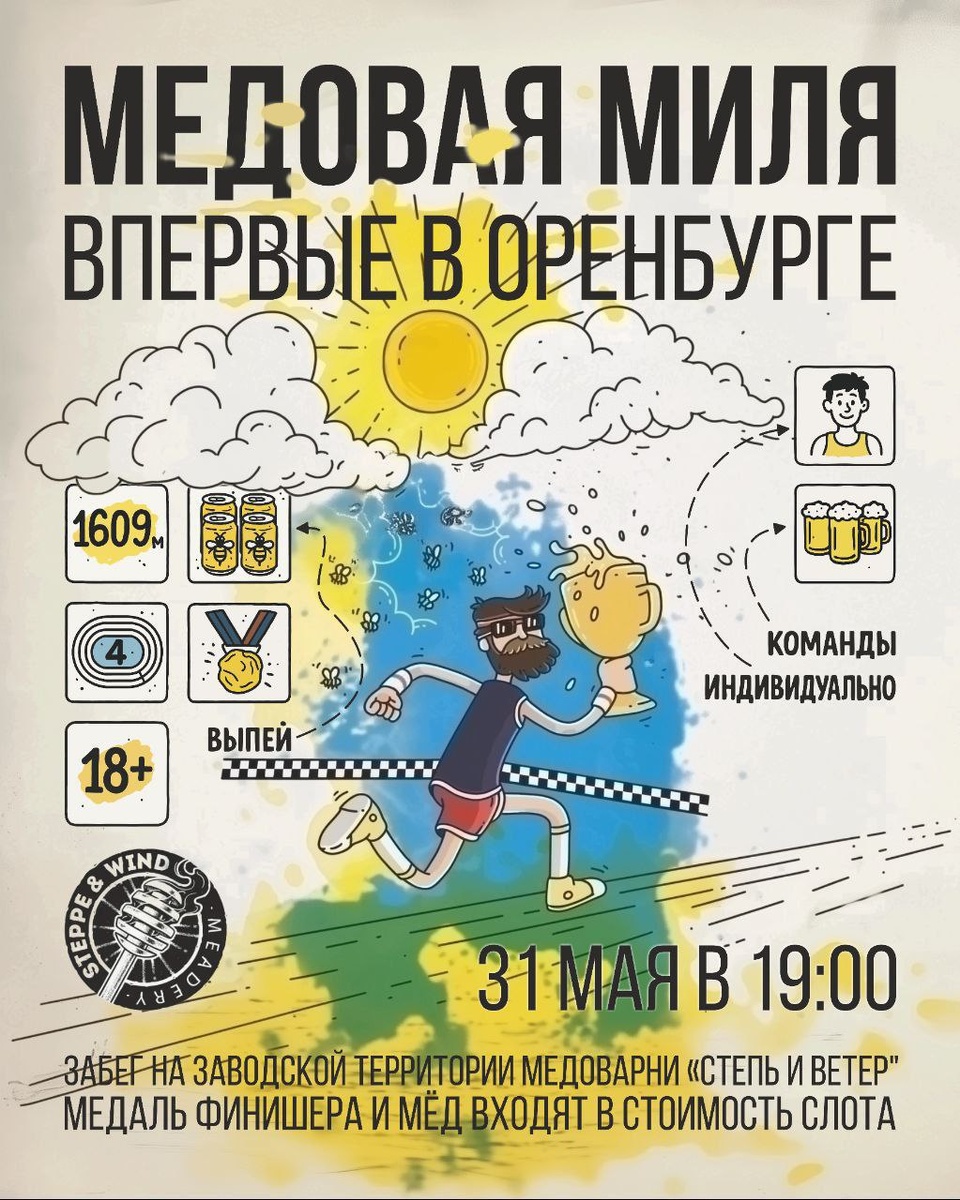 В Оренбурге в первый раз в истории города пройдет забег «Медовая миля». Он состоится 31 мая. Забег примет медоварня «Степь и Ветер». Регистрация пока открыта. Участникам предстоит пробежать 1609 метров. Каждые 400 метров бегуны должны выпивать 0,33 мл. медовухи.
