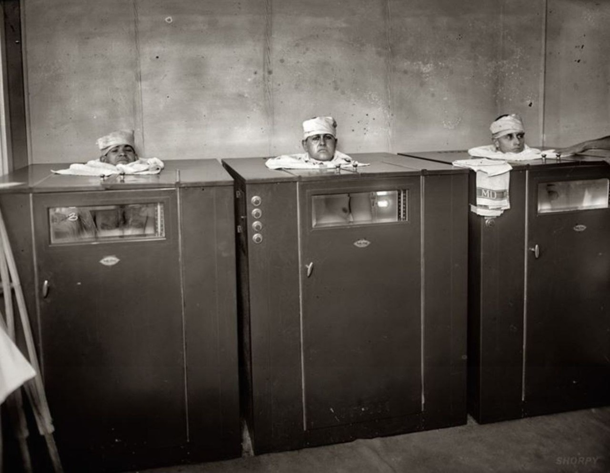 Физиотерапия 1920-х. Выглядит так, будто тебя запихнули в тостер класса люкс, но без кнопки "стоп" или в оборудование для телепортации, сломавшееся на этапе "попробуем на людях". Вообще, это, скорее всего, диатермические или инфракрасные кабины, где пациенты "нагревались для здоровья". Звучит как что-то между баней и допросом КГБ. Но главное, что лица счастливые!