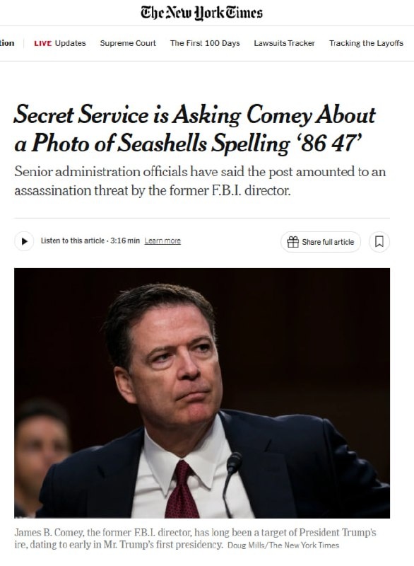 🤨 Ещё 16 числа секретная служба допросила экс-директора ФБР Джеймса Коми о фотографии ракушек с надписью «86 47», - пишет NY