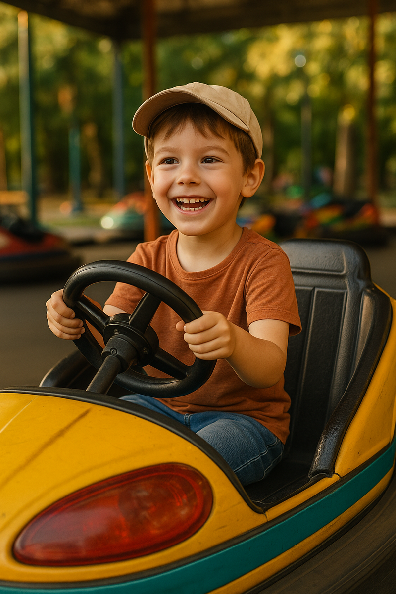 — Это его первый заезд. Он даже не понял, что не по-настоящему. Он думал — гонка. А мы думали — просто аттракцион. Но, кажется, он там родился второй раз. 📸 На фото — мальчик в жёлтой машинке, обеими руками крепко держит руль. Его кепка чуть сползла на лоб, глаза сияют, а улыбка — как у чемпиона, который только что прошёл финиш. Аттракцион старенький, но в этот момент он — трасса мечты. Всё вокруг будто остановилось, чтобы дать ему победить. 🎨 На картине: