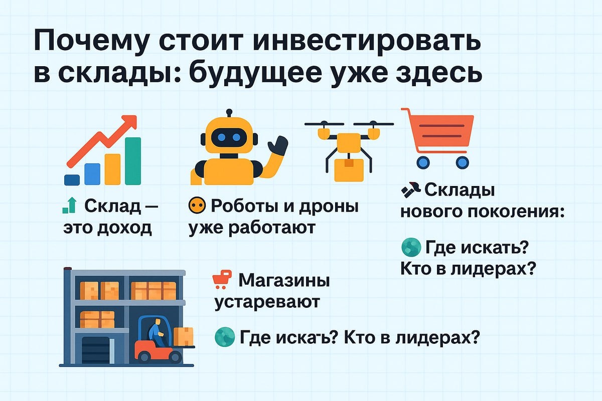 🛡 #советы 🚛 Почему стоит инвестировать в склады: будущее уже здесь Почему складская недвижимость — главная инвестиционная возможность ближайших 10 лет? 📈 Склад — это доход Склады обгоняют офисы и магазины по доходности: 🔹 12-15% годовых — склады 🔹 8-13% — офисы 🔹 9-12% — торговая недвижимость Складская недвижимость предлагает долгосрочные контракты — от 5 до 15 лет, что обеспечивает стабильный денежный поток и низкие риски. 🤖 Роботы и дроны уже работают Логистика меняется прямо сейчас: 🔹 Amazon доставляет товар дроном за 13 минут 🔹 В Китае роботы сортируют 200 000 товаров в день 🔹 Беспилотные грузовики проехали 3000 км по Европе Это сокращает затраты и ускоряет доставку. Прогнозы BCG: доля роботов в логистике вырастет до 25% к 2025 году. 🛒 Магазины устаревают С каждым годом доля онлайн-продаж растёт, и это меняет рынок: 🔹 Прогнозируется, что к 2030 году 30% всех B2C-продаж будут происходить онлайн. 🔹 Каждый миллиард евро онлайн-продаж требует 72 000 м² складов. Рыно