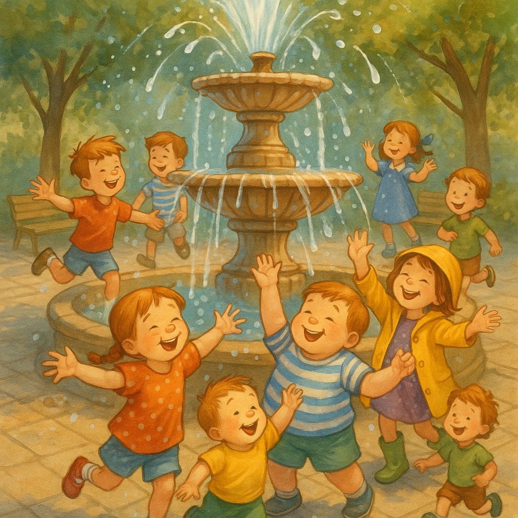 Сказка «Фонтан, который смеялся» Жил-был в самом центре города старинный фонтан. Он был не просто красивым — он был волшебным! Каждый день, когда солнце поднималось над крышами домов, фонтан просыпался и начинал плескаться, словно ребёнок, только что научившийся смеяться. Фонтан стоял на площади, окружённой деревьями и лавочками, и выглядел как гигантский цветок: лепестки распахивались струями воды, переливавшимися на солнце. Но больше всего он любил детский смех — он как будто сам становился от него ещё веселее. Каждый день после школы, после обеда, да и просто в любое свободное время сюда сбегались десятки детишек. Лиза с косичками, близнецы Артём и Тимофей, пухленький Гоша, озорная Нюра в резиновых сапожках, даже малыш Ярик, который только научился ходить — все они обожали играть возле фонтана. Кто ловил капли руками, кто бежал по мокрой плитке, кто просто сидел и слушал, как булькает вода. А фонтан смеялся. Не громко, а тихо-тихо: плюх-плюх-плюх, буль-буль-буль, словно рассказы