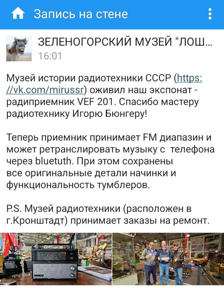 Сегодня днём сотрудник музея МИР СССР Игорь Бюнгер очередной раз посетил Зеленогорский музей ретро автомобилей или Наш ХХ век директором которого является Игорь Владимирович Коровин, который хорошо знаком с нашим музеем, а также с нашим директором Илья Александрович Шкурко. Когда я посещал в прошлый раз музей Наш ХХ век, Игорь Владимирович обратился в наш музей за технической помощью в реанимации радиоприёмника ВЭФ-201, по его словам, этот радиоприёмник был у его отца... Сегодня я привёз отремонтированный радиоприёмник и передал его заказчику, штатная работоспособность приёмника не нарушена, все диапазоны сохранены кроме ДВ, вместо него работает полноценный ФМ диапазон + Блютуз. Результат Вы можете наблюдать...