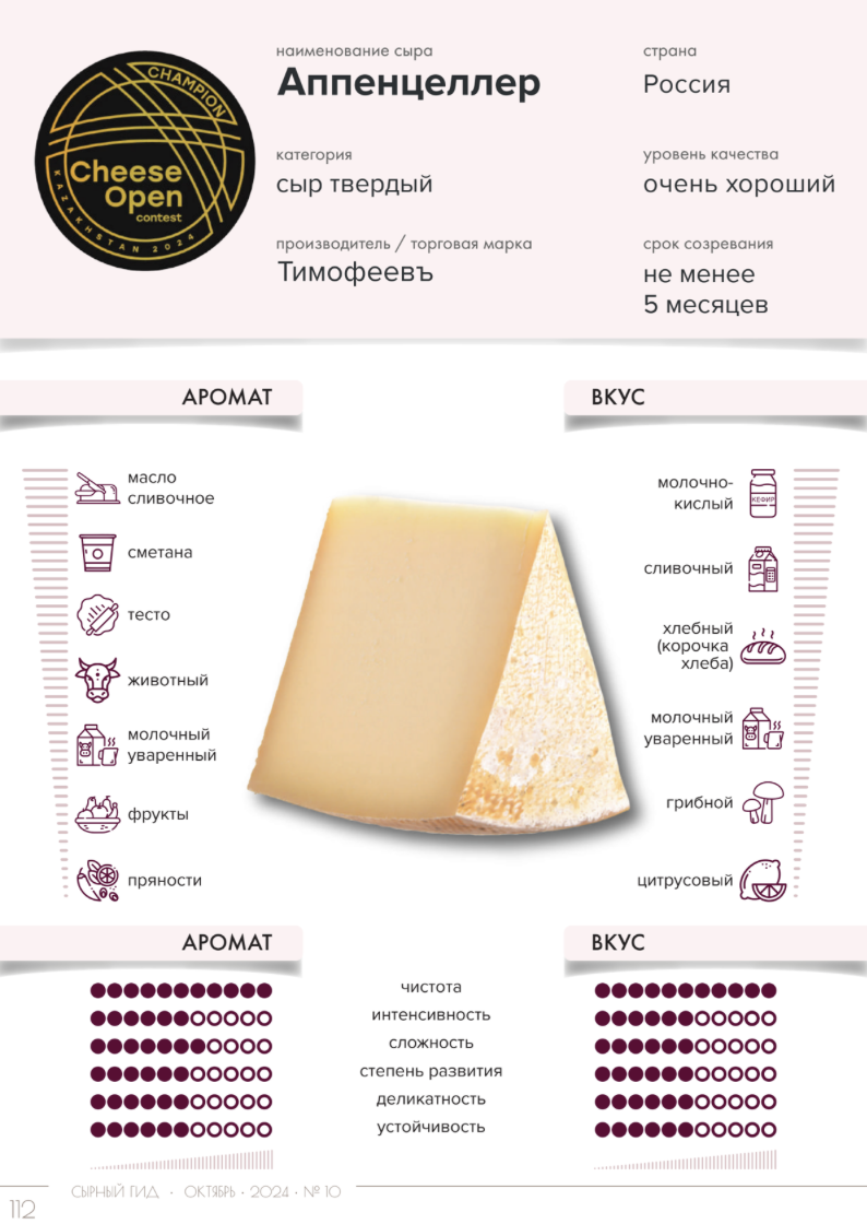 В очередном номере журнала «Сырный гид» опубликовали детальную органолептику 20-ти конкурсных образцов (Cheese Open 2024), их индивидуальные характеристики, скрывающиеся за полученным номиналом наград. В этой статье рассмотрим 4-х золотых призеров - твердые сыры. Сыр оставляет очень хорошее впечатление, с ароматикой в швейцарской стилистике – сливочность, фруктовость, пряность. Во вкусе молочно-кислая составляющая быстро сменяется сливочной, с грибным и даже цитрусовым нюансами. Остринка придает пикантности вкусу. Вкус сыра хорошо сбалансирован, при этом достаточно полный. Варианты употребления: в составе сырной тарелки, самостоятельно, в брускеттах. Сыр со сладковато-сливочной, арахисово-карамельной, дружелюбной ароматикой. Ароматика интенсивная и сложная, вкус чуть приглушен по интенсивности, при этом у сыра хороший баланс. Варианты употребления: в составе сырной тарелки, самостоятельно, в составе холодных блюд. Сыр с ароматикой и вкусом сливочно-молочнокислой направленности, перехо