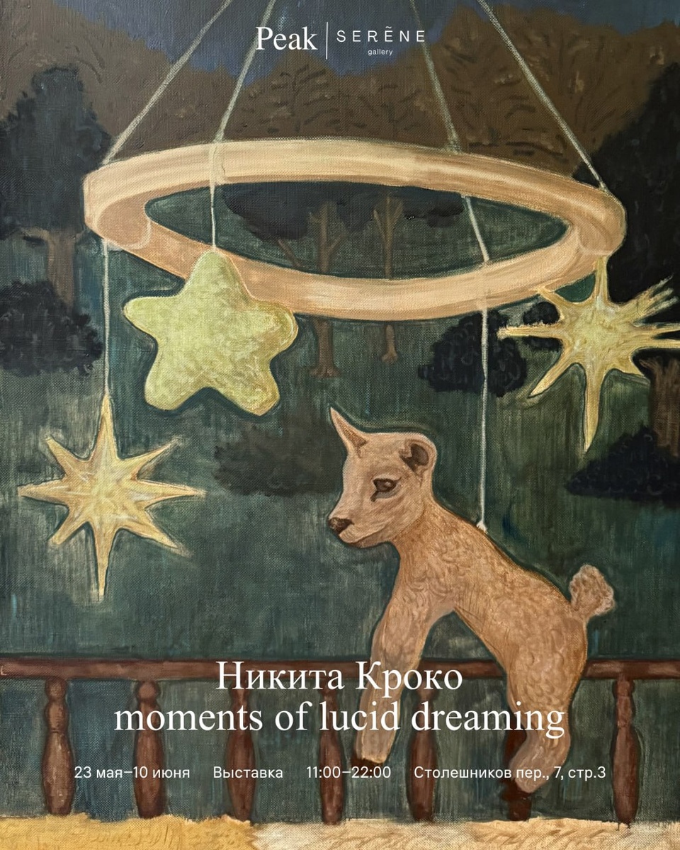 В пространстве Peak Souvenir в Столешниковом переулке открывается персональная выставка Никиты Кроко вместе с галерей Serẽne. Проект художника Moments of lucid dreaming отражает, по словам организаторов, «пограничный момент при переходе в бессознательное, сон. Это сложно уловимое чувство, которое появляется лишь на мгновение». Открытие выставки — 23 мая.
