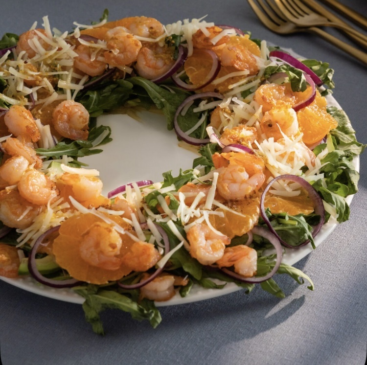 Выложить на тарелку сначала руколу,а на неё - авокадо, лук, мандарины и креветки. Чтобы получилась форма венка, надо поставить в центр кулинарное кольцо или стакан. Пармезан натереть на тёрке или нарезать тонкими полосками и посыпать салат.