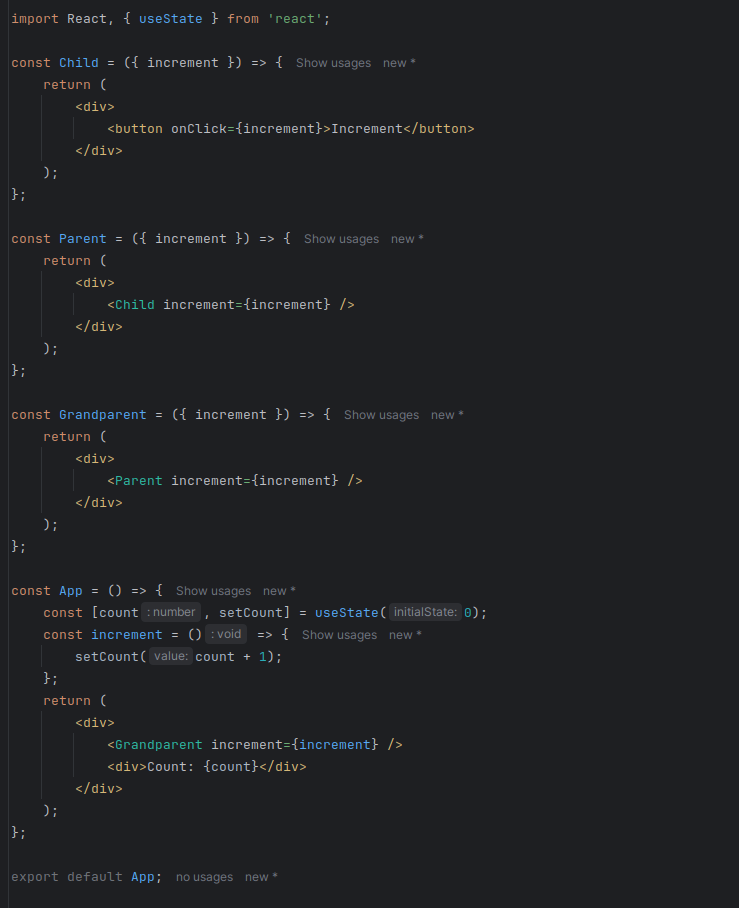 Здесь вы можете видеть, что функция приращения передается вниз через несколько слоев компонентов только для того, чтобы быть использованной в компоненте Child. Если приложение увеличивается в размерах или между App и Child появляется больше компонентов, этот шаблон prop drilling приведет к большому количеству избыточного кода, что усложнит его поддержку.