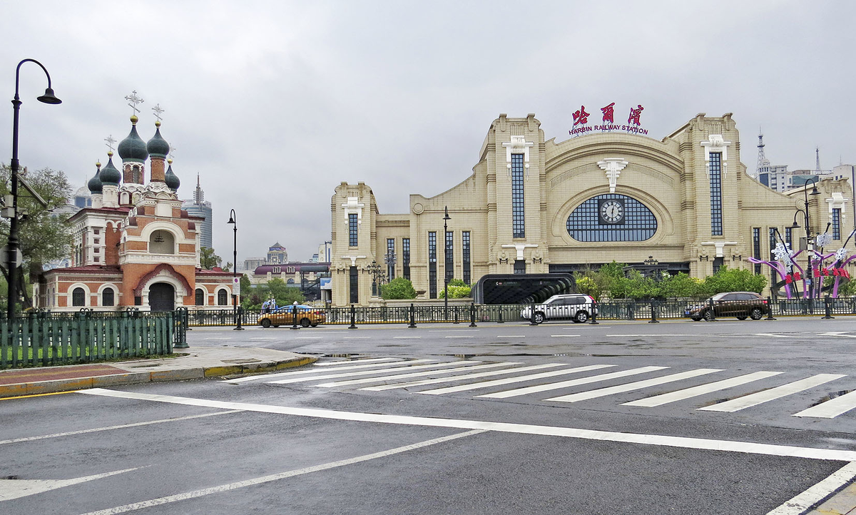 В Харбине новодельный фасад по-китайски колоссального вокзала образовал гармоничный ансамбль с Иверской церковью (1907-08). Старейшая из уцелевших в Харбине, она построена по инициативе генерала Николая Чичагова, командующего Заамурским округом Охранной стражи, как памятник павшим на русско-японской войне и при подавлении Боксёрского восстания. О первой в Харбине напоминают названия предместий Корпусный и Госпитальный городок, начинавшихся с военного лагеря и госпиталей, а вот радикальные националисты и буддийские фундаменталисты ихэтуани ("Отряды справедливости и мира" - настоящее название "боксёров", прозванных так за применение боевых искусств) при поддержке армии Цин безуспешно осаждали Харбин летом 1900 года. Снаружи церковь подлатали в 2015-17 годах, при строительстве вокзала, но она заперта и по факту всё ещё заброшена: Выйти на площадь со стороны Пристани - нетривиальная задача: подземные переходы, заезды и парковки образуют там объёмный лабиринт. Даже кадры с видами церкви