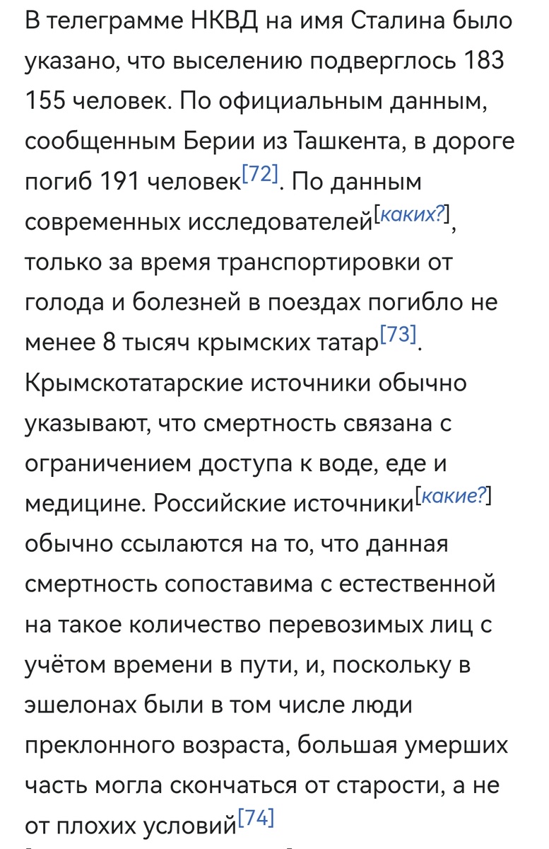 Сидела я себе и не торопясь писала статью. Вернее, размышляла по поводу другой, очень интересной статьи, но... Пришлось её отложить. Я сегодня вообще никуда не спешила, решила себе полноценный выходной сделать, интересное что-нибудь почитать, передачи и фильмы посмотреть, а тут новости. По России 1 после основных новостей идут местные и тут до меня дошло, что сегодня 18 мая. Своеобразно дошло, фраза резанула: "огульно обвинили". А потом ещё одна: "в пути погибло до 40% людей"... Журналисты России 1, обитающие в Крыму, вы обалдели? Официальные документы не в счёт? А про 40% вообще феерично. Есть таблетки для памяти, а нашим крымским журналистам похоже таблетка для ума нужна Даже если взять в расчёт 8тысяч, то это далеко не 40%. Это даже не 5%. Писала и повторю - пока не откроют все архивы, не звучат фамилии всех предателей, с экранов ТВ будет литься чудовищная ложь. Нельзя втаптывать в грязь память большинства, чтобы не обидеть меньшинство. П. С. Вчера тоже услышала удивительный ре