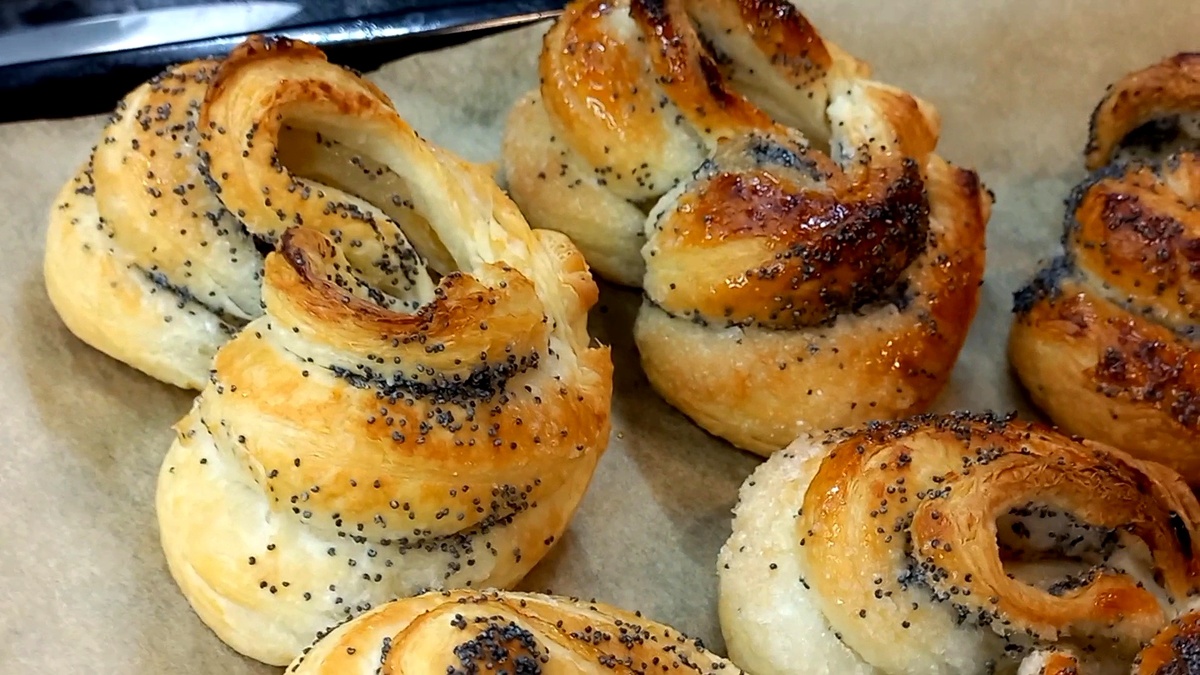 Тесто слоеное раскатать, смазать растительным маслом, посыпать сахаром и маком. Разрезать на квадраты.