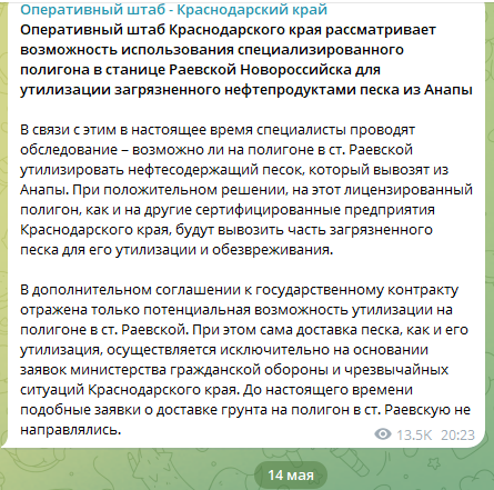 13 мая 2025: Оперативный штаб Краснодарского края рассматривает возможность использования специализированного полигона в станице Раевской Новороссийска для утилизации загрязненного нефтепродуктами песка из Анапы