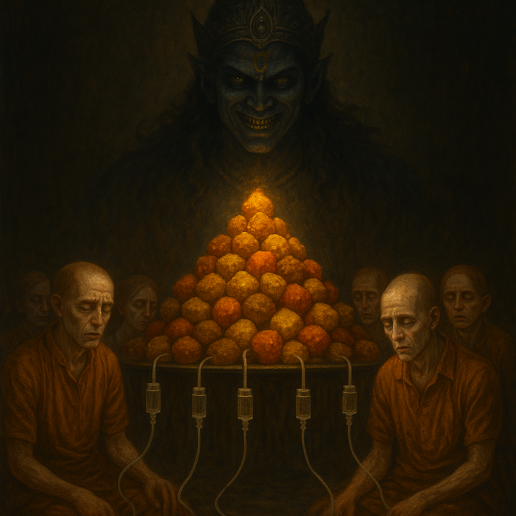 Ближайший аналог в реальности — маркетинг фастфуда: продаётся не еда, а идея. Только вместо концепции "вкусного и точка" — подаётся "святого и точка". Шарики ладу, щербеты, халавы, сладкие рисы, чапати с сахаром, торты без яиц, но с тоннами сгущёнки — всё это красиво упаковано под вывеской духовности. Но вот парадокс: по своим нутриентным профилям это — ультрапроцессированные продукты с огромной углеводной нагрузкой и практически нулевыми аминокислотами, без полноценного белка и без насыщенных жиров.