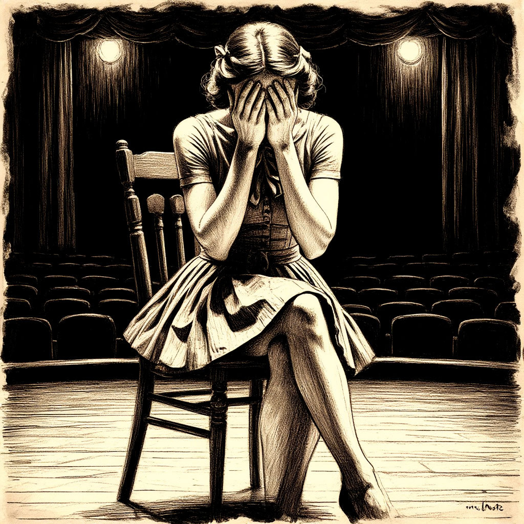 "Посередине, на самой авансцене сидела Малолеткова. Царившая тишина заставляла ожидать чего-то особенного от той, которая была на сцене. Она осторожно отняла от лица одну руку, потом другую, но при этом опустила голову так низко, что нам была видна лишь ее макушка с пробором. Наступила новая томительная пауза. Она стала поправляться, пересаживаться, принимать нелепые позы, откидываться, наклоняться в разные стороны, усиленно вытягивать свою короткую юбку..."