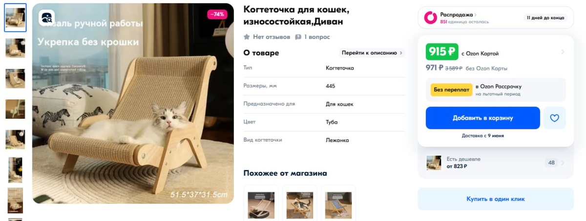 На OZON Когтеточка для кошек за 915 рублей с OZON картой (за 971 рублm без карты) и с доставкой из-за рубежа. Когтеточка в оригинальном формате кресла, Ваш питомец может точить когти и лежать в нём. Выдерживает до 10 кг. Есть варианты дешевле, но у ноунейм магазинов без единого отзыва. У данного магазина оценка 4,7 звёзд. Ссылка на наш канал
