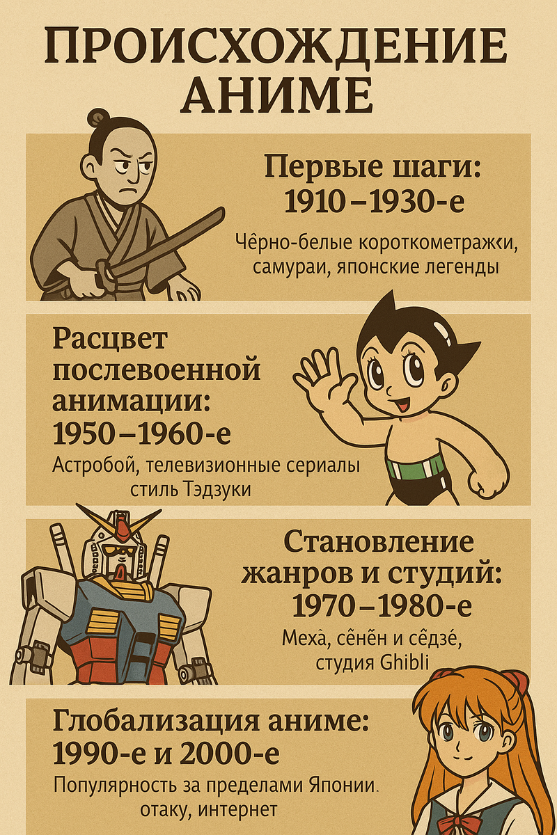 Аниме сегодня — это не просто японская анимация, а целая культурная вселенная, захватившая умы и сердца миллионов по всему миру. Однако путь аниме от черно-белых короткометражек до мировой индустрии длился более ста лет. Давайте окунёмся в историю и разберёмся, как всё начиналось. 🏁 Первые шаги: 1910–1930-е Самые ранние попытки создания японской анимации относятся к началу XX века. Вдохновлённые западными мультфильмами, японские художники начали экспериментировать с техникой покадровой съёмки. Одним из первых аниматоров считается Сэитэн Дзюнъити, а первая сохранившаяся работа — «Намакура Гатана» (1917), короткометражка о неудачливом самурае. Эти фильмы были немыми и черно-белыми, но уже тогда в них можно было заметить национальный колорит: самураи, гейши, японские легенды. 📺 Расцвет послевоенной анимации: 1950–1960-е После Второй мировой войны Япония оказалась в разрушенном состоянии, и мультфильмы стали способом отвлечения от реальности. В это время на сцену выходит ключевая фигура