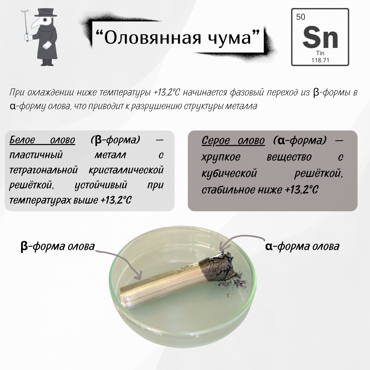 Больше интересного про химию, а также полезные конспекты для экзаменов в ТГ-канале: Экспедиция Роберта Скотта к Южному полюсу (1910–1912 гг.) завершилась трагически: все участники погибли на обратном пути. Одним из факторов, усугубивших их положение, стала «оловянная чума» «Оловянная чума»— это физико-химическое явление, при котором металлическое олово (β-олово) превращается в порошкообразную серую модификацию (α-олово) при низких температурах. Этот процесс связан с аллотропией — способностью вещества существовать в разных структурных формах. Превращение начинается с отдельных точек, постепенно охватывая весь материал, что напоминает распространение болезни — отсюда название «чума». Серые пятна на олове визуально похожи на язвы. Сам процесс фазового перехода может занять годы при температуре чуть ниже +13°C, но при -30°C процесс завершается за недели. При этом обратный процесс невозможен: при нагревании α-олово не возвращается в β-форму — требуется переплавка. При чем же тут поляр