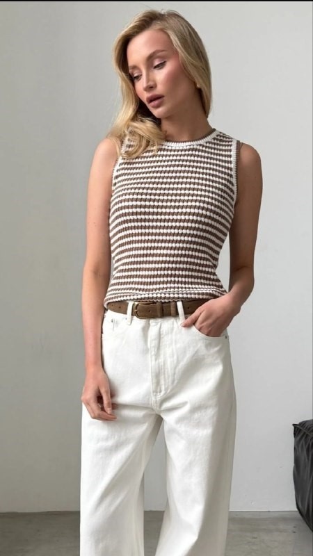 Пролистывая ленту WB мне на глаза попался данный топ и на секундочку мне показалось, что это ручная работа На самом деле этот топ промышленной вязки и поэтому мне захотелось добавить его в рубрику #СвязатьНельзяКупить Рассмотрим этот топ внимательнее: 95% хлопок, 5% эластан, полоски шоколадного и молочного цвета, обработка резинкой 1х1 Тут используется достаточно интересный узор, мне кажется, что это спущенные накиды при каждом смене цвета, потому что я не вижу тут убавок, но вижу накиды Подробнее изучить информацию и ознакомиться с фотографиями можно в карточке этого топа При достаточно высокой стоимости для топа из хлопка (3000 рублей) мы можем обратить внимание на шелк/хлопок с кашемиром/вискозу/меринос с хлопком для вязания такого топа своими руками, благо, такие базовые цвета достаточно легко найти А для вязания более бюджетного варианта мы можем обратить свое внимание на артикулы из Турции и России, такие как - Камтекс Альма, Alize Bella, Пехорка Хлопок натуральный, Gazzal Giza/G
