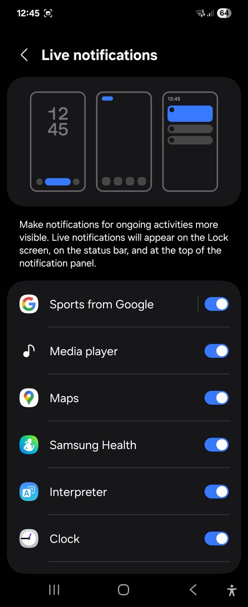 Вы можете настроить Полосу уведомлений в настройках экрана блокировки и AOD. Перейдите в Настройки > Экран блокировки и AOD > Полоса уведомлений. Я активировал настройки для Мультимедиа, Карт, Samsung Health и Часов и отключил остальные.