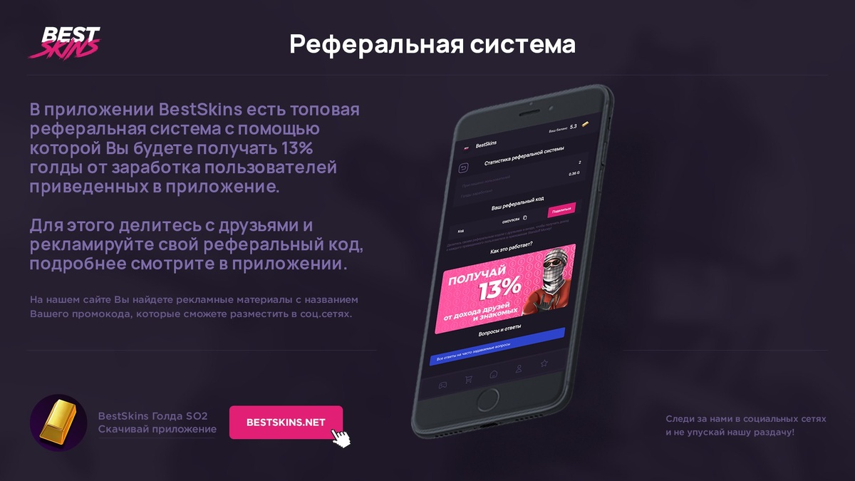 Реферальная система BestSkins Голда 🚀 Приглашай друзей и всех остальных в BestSkins и зарабатывай 13% от их дохода пожизненно! 😎 Узнай свой код в реферальной системе и рекламируй его, а друг получит 2 голды за активацию! ⭐️ 🔱 Скачать - https://bestskins.net/