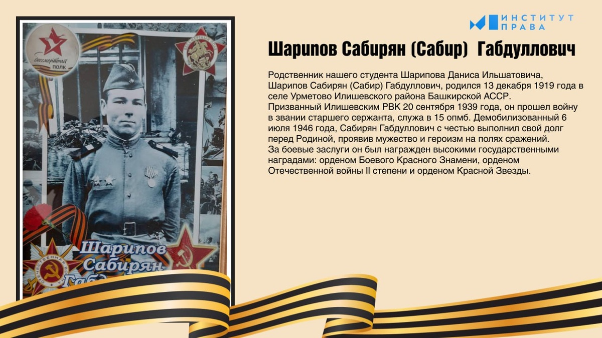 Судьба солдата: Память живет в наших сердцах! Институт права продолжает серию публикаций о ветеранах Великой Отечественной войны, чьи истории бережно хранят наши студенты. Это дань уважения героям, ковавшим Победу! 🙏 🔹Узнайте о подвигах дедов и прадедов, их вкладе в мирное будущее страны, из первых уст – от нашего молодого поколения юристов!