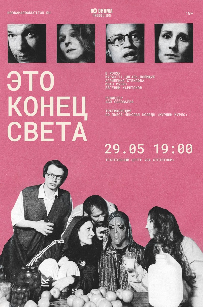 В Театральном центре «На Страстном» 29 мая состоится московская премьера спектакля «Это конец света» по культовой пьесе Николая Коляды «Мурлин Мурло». На сцену выйдут Мариэтта Цигаль-Полищук, Агриппина Стеклова, Иван Мулин и Евгений Харитонов. В вымышленном провинциальном городке Шипиловске в обыкновенной скромной квартире живет Ольга — слегка блаженная и очень добрая. Вот уже два месяца с женатым соседом по лестничной клетке Мишей у нее постыдный роман, который она всеми силами пытается прекратить. Пару дней назад к ним в квартиру заехал новый жилец из Ленинграда — интеллигентный Алексей, который Оле сразу понравился. Внезапно в квартиру заявляется старшая сестра Оли — Инна. Она эксцентричная, яркая и, как обычно, навеселе. Героям предстоит как можно скорее разобраться со своими отношениями и чувствами, ведь Инна приносит с собой новость, которую она только что услышала по радио: конец света наступит уже сегодня. Режиссером постановки выступила Ася Соловьева, а продюсером значится Дар