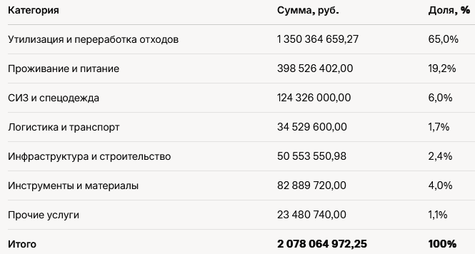 - Утилизация отходов (пункт 34): 793 558 600,00 руб. (38,2% от общего бюджета).