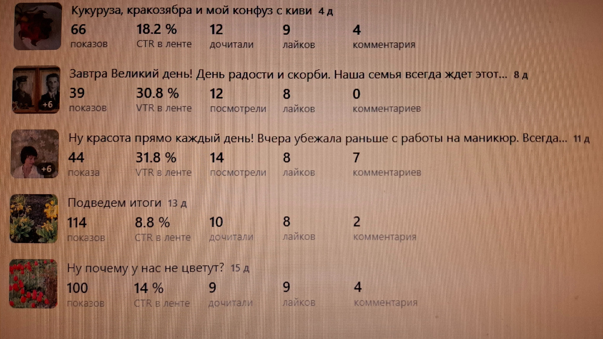 У меня канал очень маленький, плохо развивающийся. Первые публикации были в печатном виде, потом я перешла на видео формат. О чем пишу, о чем снимаю? О всем, что приходит в голову. Главное, о своей жизни. Что волнует, где была, что видела, что люблю, чем интересуюсь. Таких каналов на Дзене пруд- пруди. Вроде бы начало было не плохое, люди заходили, читали, смотрели, подписывались. Довольно за короткое время добралась до монетизации. Канал развивался и я была довольна. Потом был долгий перерыв и все заглохло. Недавно решила возобновить свои публикации в печатном виде. Мне это нравится, мозги работают, написать есть о чем, да и потом, самой интересно почитать, вспомнить, что было в жизни. Конечно же хочется, чтобы не одна я читала свои статьи, но другие люди заходили в гости. Пока это мои верные друзья, которым я очень благодарна. Скорее всего пишу не достаточно интересно, буду учиться. Обратила внимание, что показов очень мало. Статьи добавляю от случая к случаю: через день, через три.