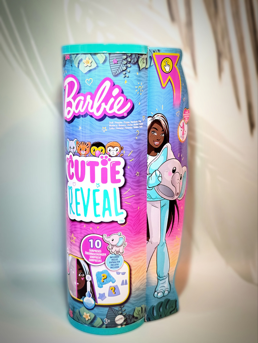 — Купи слона! — Зачем мне слон? — Все спрашивают "зачем мне слон", а ты купи слона. — Отстань! — Все говорят "отстань", а ты купи слона. Я и купила! Дорогие читатели, сегодня хочу показать вам Барби из серии Cutie Reveal. В 2022 году компания Mattel впервые выпускает потрясающую серию кукол в костюмах в виде животных — Barbie Cutie Reveal. Открыв коробку, похожую на тубус, покупатель увидит в ней кроме куклы 4 непрозрачных пакетика с аксессуарами. Забавно, что на крышке упаковки есть вот такое отверстие в форме сердца. А вот и мой слон! В костюме животного, почитаемого в Африке, пряталась Барби с молдом Мбили. В серии Cutie Reveal Jungle ("Джунгли") представлены и другие куколки: В октябре 2023 года Катюша @Барби и ее подруги организовала розыгрыш, предложив читателям угадать, какое "животное" поселилось у неё в коллекции. Самое волшебное в этой истории то, что я угадала, написав в комментариях к посту "тукан". Получается, что в какой-то мере данная серия кукол помогла нам подру