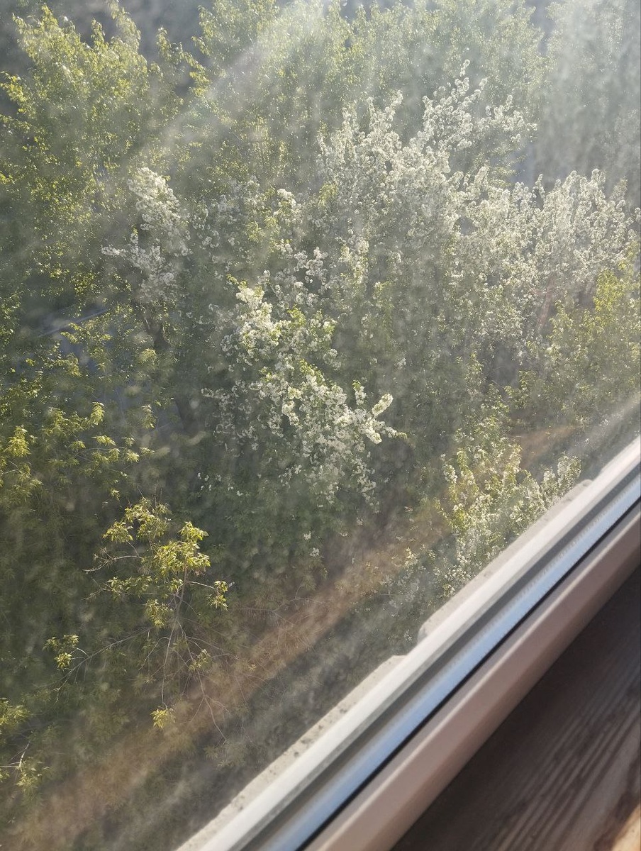Не могу подобрать ракурс: то солнце слепит, то разводы после дождей на стекле сильные. Под окнами зацвели яблони - целая аллея 🌿 Одуряюще пахнут. А напротив подъезда готовится сирень. Неделю будем вокруг дома курсировать и дышать ))
