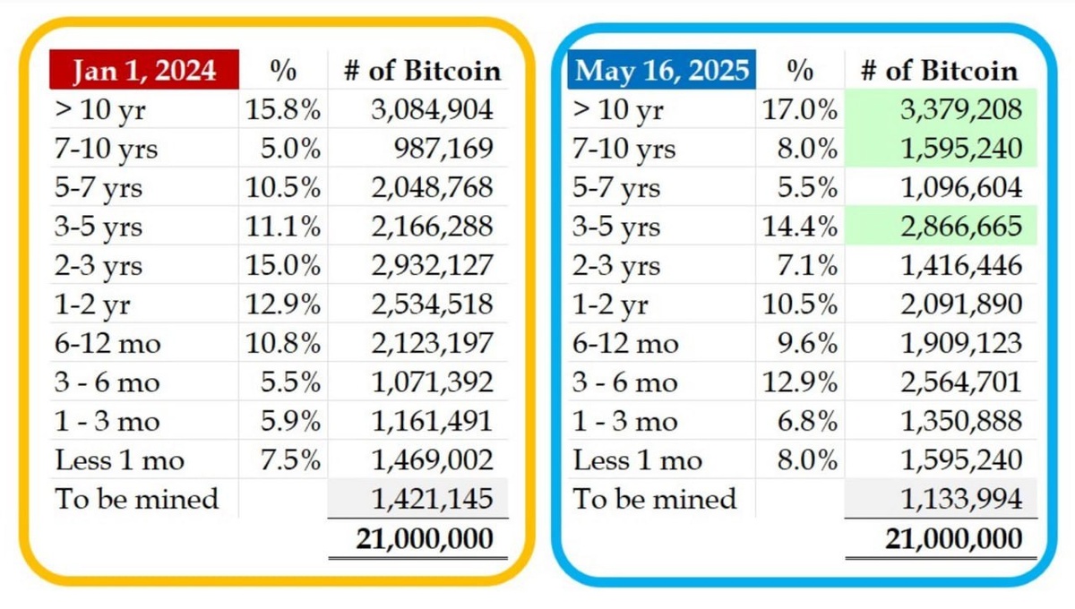 Более 17% всех BTC (3.37 млн BTC) не перемещались уже более 10 лет — это исторический максимум