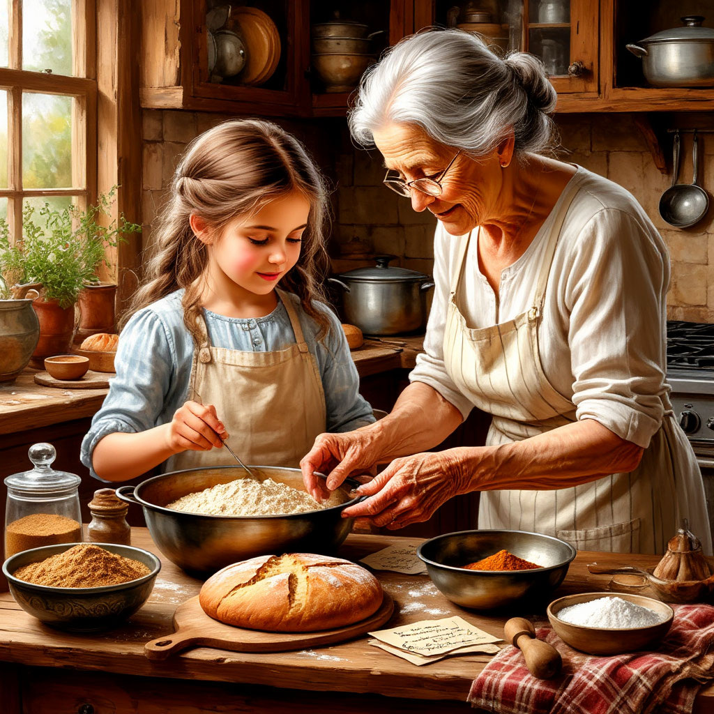 На старой деревянной кухне царила особая атмосфера. Пахло ванилью, корицей и теплым, только что испеченным хлебом. Свет из окна мягко ложился на морщинистое лицо бабушки Ани и освещал ее серебристые волосы, собранные в аккуратный пучок. Рядом с ней, старательно склонившись над большой миской, стояла ее внучка, маленькая София. Вместе они колдовали над тестом, готовя свой фирменный бабушкин пирог. Бабушка Аня, с любовью и терпением, показывала Софии, как правильно смешивать ингредиенты, как аккуратно вымешивать тесто и как придавать ему нужную форму. Ее руки, натруженные и морщинистые, но такие теплые и добрые, передавали внучке не только рецепт, но и частичку своей души. София, с широко раскрытыми глазами, внимательно следила за каждым движением бабушки. Она была очарована волшебством, происходящим на кухне, и с удовольствием помогала бабушке во всем. Ее маленькие ручки, испачканные в муке, неуклюже, но старательно смешивали тесто, добавляя в него щепотку любви и хорошее настроение. Н