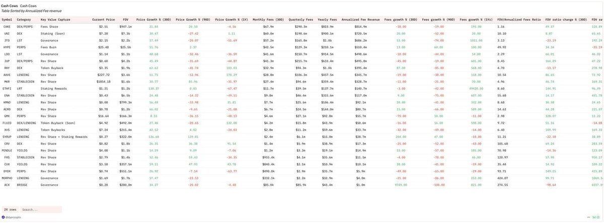 DeFi-коровы: кто зарабатывает реальные деньги прямо сейчас Инвесторы, гляньте на этот срез. Это топ-24 DeFi-протокола, отсортированных по реальной выручке — годовой доход, получаемый с комиссий. Не токеномика, не обещания, а живые деньги, которые генерирует протокол. Анализ с помощью метрики Annualized Fee Revenue. Что видно? 1. Лидеры — CAKE, UNI, LST и HYPE – CAKE (PancakeSwap) — почти $815M в год выручки и FDV/Revenue Ratio 1.16. Это значит, что весь проект оценивается чуть выше своей годовой выручки. – UNI — всё ещё не включает ревард-холдерам, но генерирует $720M. И они собираются ввести стейкинг. 2. JTO и LDO — сильные игроки в категории Governance и LST JTO показывает +53% рост за год, но по выручке пока уступает. LDO (Lido) генерирует ~$498M и выглядит уверенно, несмотря на просадку по цене. 3. Новички с сильным импульсом — RAY, FLUID, AERO, GRAIL – RAY (Raydium) вырос на 170% за год и генерит ~$395M выручки. Использует токен-байбэки. – FLUID показывает +112% по цене за