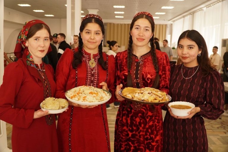 Очаровательные, яркие студентки из Туркменистана учатся на разных факультетах, но живут вместе. С готовкой в общежитии нет никаких проблем. В помощь хозяюшкам — современные плиты. Уж они и напекли, и нажарили для выставки! Правда, плов, который дома обычно делают с говядиной, в этот раз приготовили с курицей. Но рецепт традиционного лакомства туркменской кухни – пишме – остался без изменений. Это что-то среднее между печеньем и хворостом. Русские и мордовские блюда