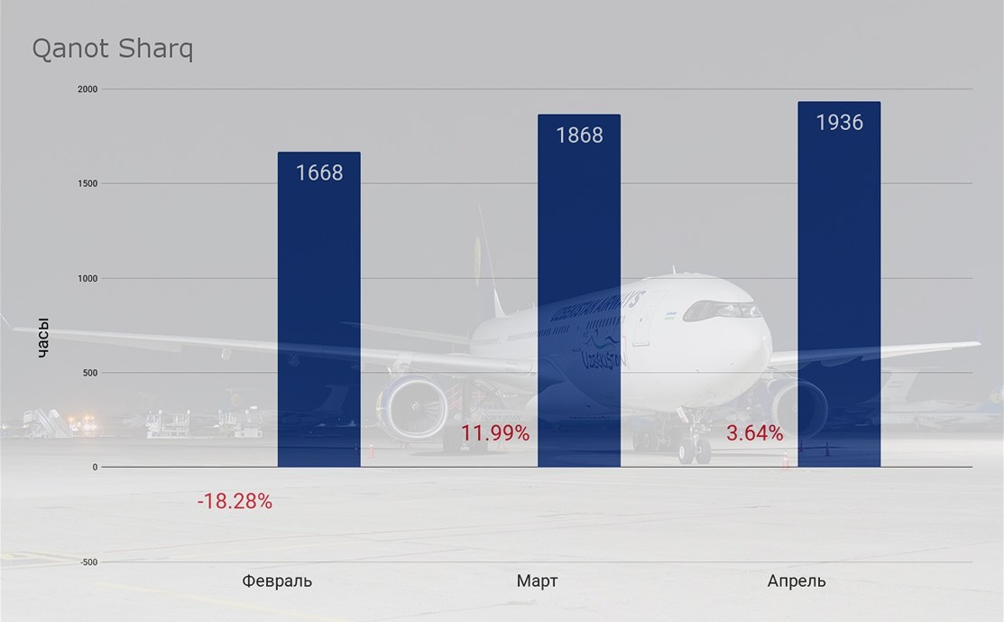 Суммарное количество часов налёта воздушных судов авиакомпании Qanot Sharq за апрель увеличилось 🔼 на 3.64% по сравнению с мартом и составило 1936 часов.