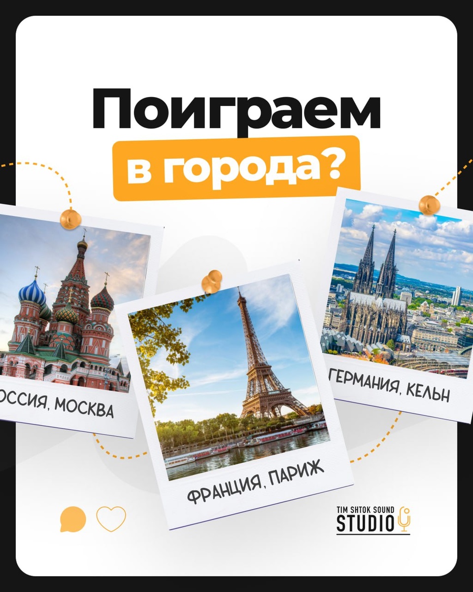 Поиграем в города? 😉 Но не в стандартные «Москва — теперь ты на «А» и даже не в «Москва — Воркута, потому что я там сидел». Предлагаем совершенно другой вариант игры. ⤵️ Пишите в комментариях самые известные достопримечательности и памятные места вашего города. А лучше — выкладывайте фото! А другие подписчики попробуют отгадать, в какой стране и в каком городе вы живете. Поиграем? 🏘 PS: Кстати, мы международная онлайн-школа. У нас нет привязки к конкретному адресу в какой-либо стране или городе. Наши студенты обучаются удаленно с помощью платформы GetCourse.