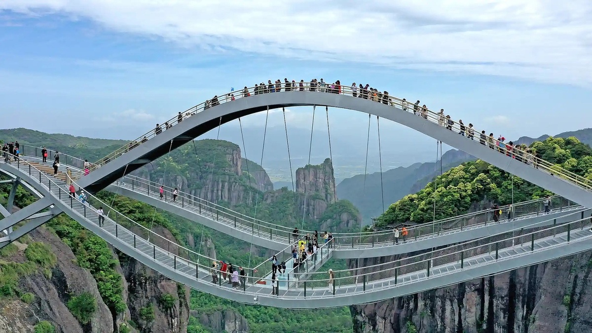 В живописной провинции Чжэцзян, известной своими захватывающими пейзажами и богатым культурным наследием, находится мост Жуйи - пешеходный мост в Тайчжоу, провинция Чжэцзян, Китай. Он построен для пересечения долины Шэньсяньцзю. Длина моста 100 метров, высота 140 метров. Название и форма моста вдожновлены традиционным буддистским скипетром жуйи, символом удачи и благополучия. Этот элемент придает мосту особое символическое значение, делая его не только местом для прогулок, но и магнитом для тех, кто ищет в жизни положительные изменения. Мост волнистый и имеет три отдельные пешеходные дорожки, части которых имеют стеклянное дно. Дизайн был описан как три волнистых моста, призванных гармонировать с природным пейзажем. Журналистка Мадлен Грей из описала внешний вид моста как "смесь цепочки ДНК и футуристического глаза Саурона". Конструктор моста Хэ Юньчан — тот же инженер-строитель, который участвовал в проектировании стадиона "Птичье гнездо", использовавшегося для проведения Олимпийски