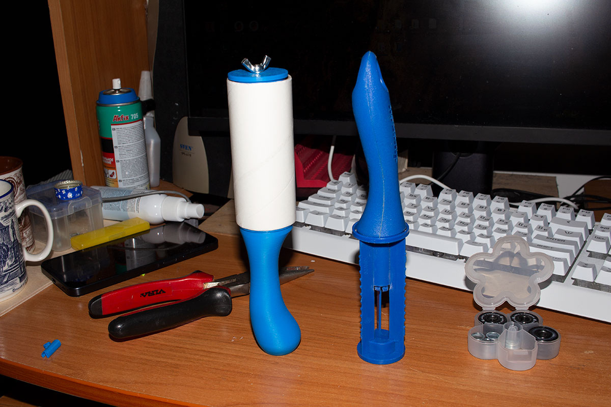 Наверно в каждой квартире, где имеются домашние животные, есть этот гаджет. Катушка на ручке с липкой лентой, которой чистят одежду от шерсти. Штука хорошая, но сама конструкция катушки с ручкой не слишком продумана. То катушка с ручки слетит при использовании, то бобина с катушки. Попросила жена, разобраться с этим. Хватило вечера. Смоделировал три детали. Катушку с ручкой соединил неразъёмно - осью с подшипниками от самоката (пылились на антресолях), а бобину со скотчем зафиксировал на катушке верхним-съёмным диском на болт-барашек. Жена довольна )).