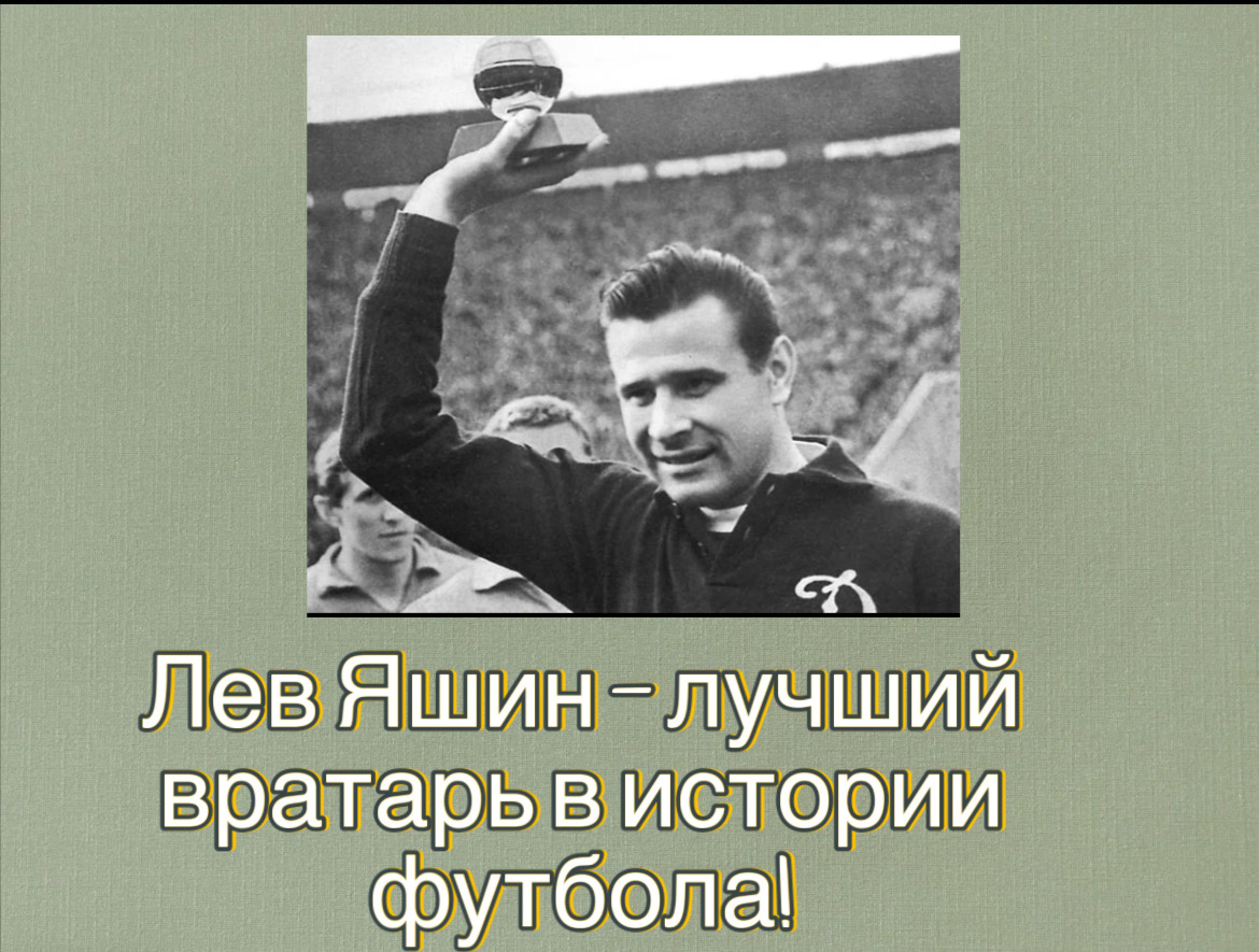 Триумф! 🤩 Международная федерация футбольной истории и статистики (IFFHS) официально признала Льва Яшина величайшим вратарем в истории футбола! 🧤 Легендарный голкипер “Динамо” и сборной СССР заслужил этот титул своим талантом, мастерством и преданностью игре! ⚽ Яшин – легенда мирового футбола! 🌟 Лев Яшин – это не просто вратарь, это легенда мирового футбола. 🦸♂️ Он: Подтверждение статуса: IFFHS признала Яшина лучшим! ✅ Ранее FIFA уже признала Льва Яшина лучшим вратарем XX века. Теперь статус подкреплен еще одним престижным титулом от Международной федерации футбольной истории и статистики (IFFHS)! ✅ Наследие великого вратаря! 🙏 Лев Яшин оказал огромное влияние на развитие вратарского искусства. Он: Память о легенде жива! ❤️ Имя Льва Яшина навсегда вписано в историю мирового футбола. ✍️ Он является примером для подражания для многих поколений вратарей и остается одним из самых любимых и уважаемых спортсменов в нашей стране.