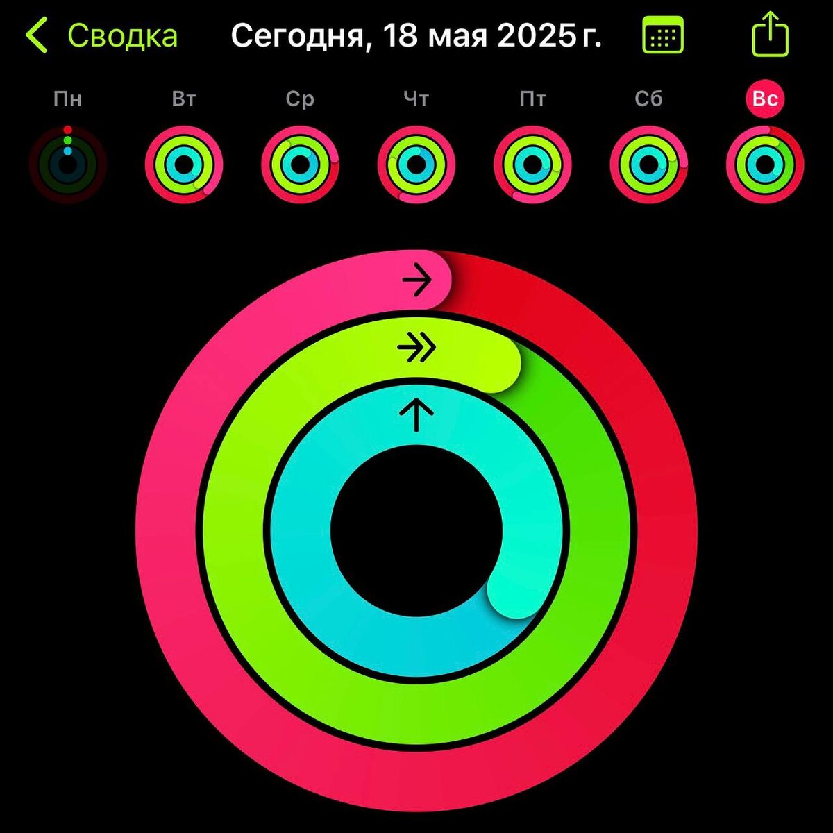 Самое время подвести спортивные итоги недели) Всю неделю закрывал кольца активности, только в понедельник забыл надеть часы, так что получить награды за неделю не получится😫 Для тех, кто понимает, что это за круги, распишу свои минимальные ежедневные цели: 1) Подвижность - 1000ккал 2) Упражнения - 30 минут 3) Разминка - 12 часов
